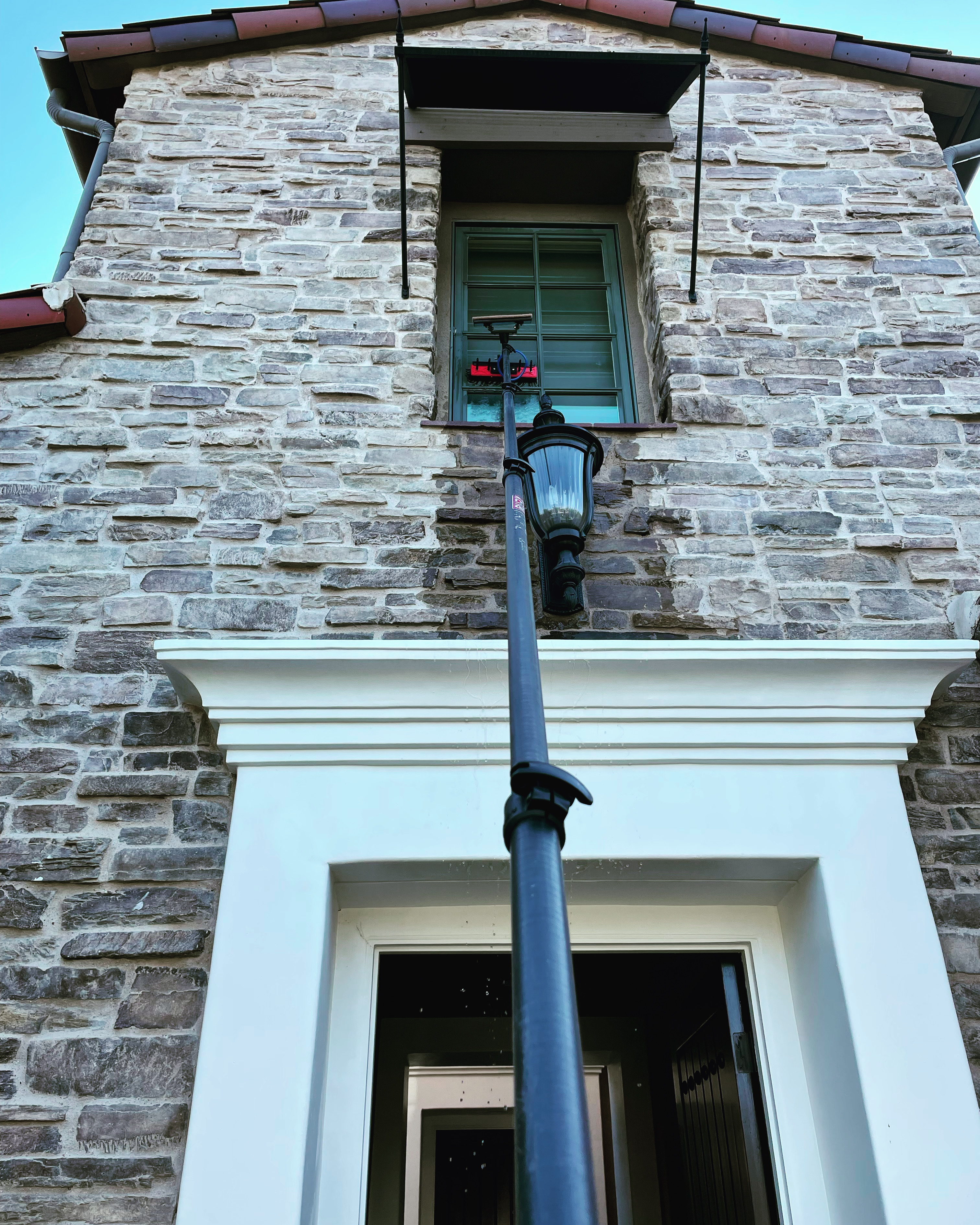 We use a deionized purification system (same technology used at a spot free car wash!), with a water fed pole system. Using a commercial grade glass safe nylon brush, we scrub the frames, glass panes, and sills on the exterior of the windows. Then, using the purified water we rinse everything down to leave a spot free finish!