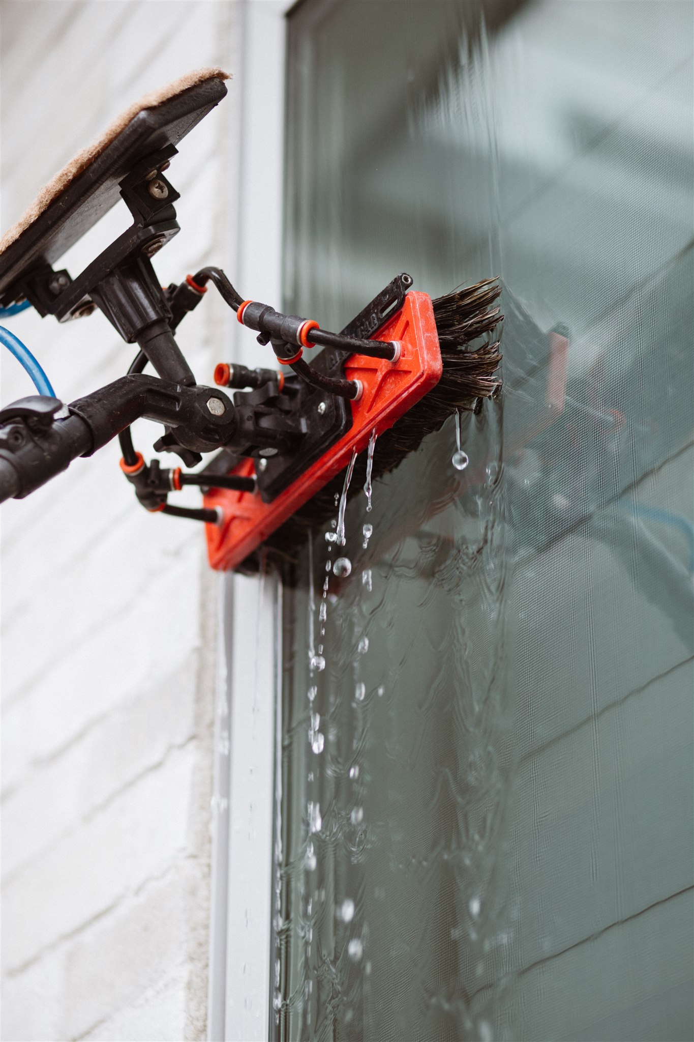 We use a deionized purification system (same technology used at a spot free car wash!), with a water fed pole system. Using a commercial grade glass safe nylon brush, we scrub the frames, glass panes, and sills on the exterior of the windows. Then, using the purified water we rinse everything down to leave a spot free finish!